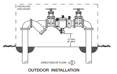 - Vị trí lắp đặt: Cụm lắp ráp phải được lắp ở độ cao tối thiểu là 12" (305mm) và tối đa là 30" (762mm) phía trên rãnh thoát nước thích hợp. Khoảng trống bên cạnh phải đủ để kiểm tra và bảo trì dễ dàng.